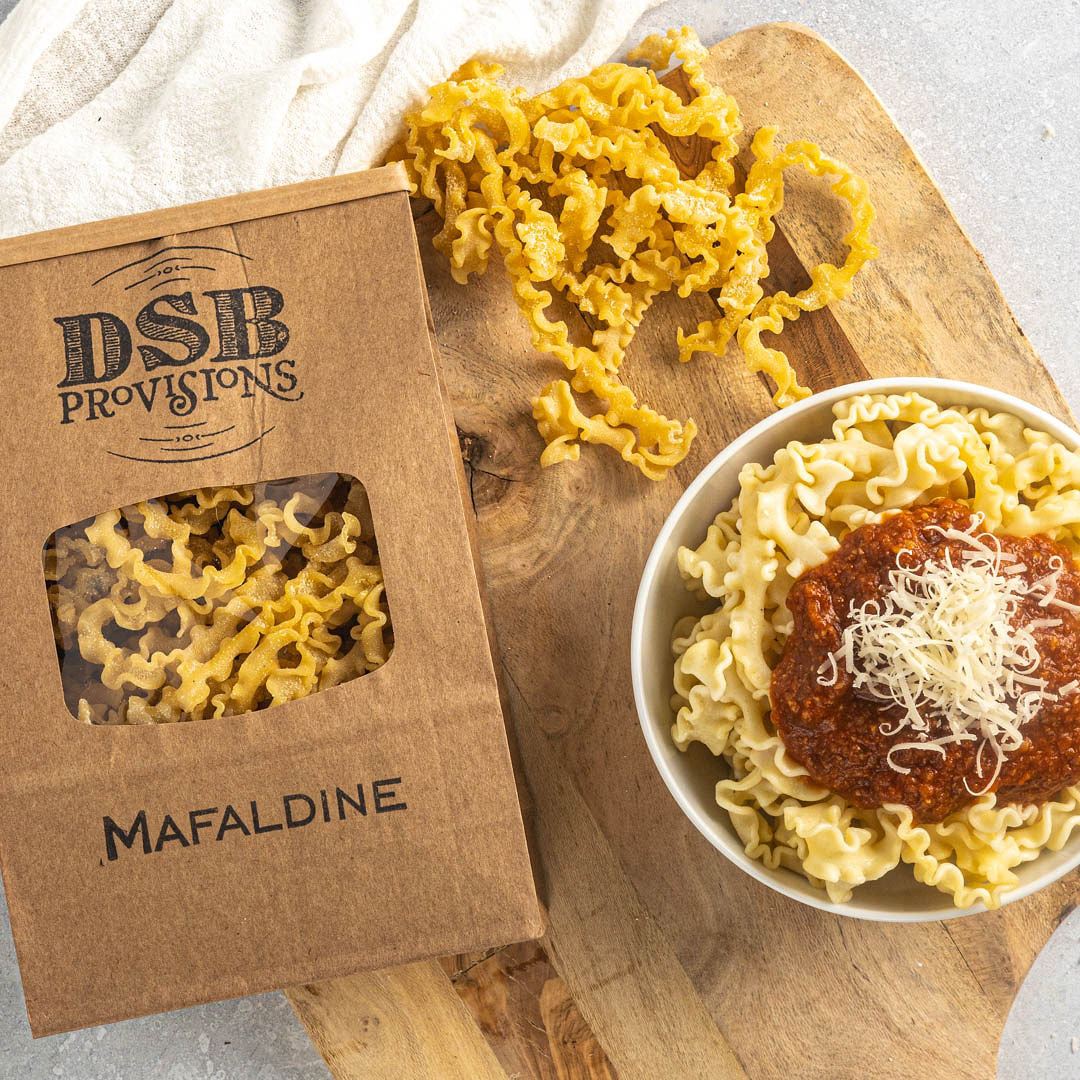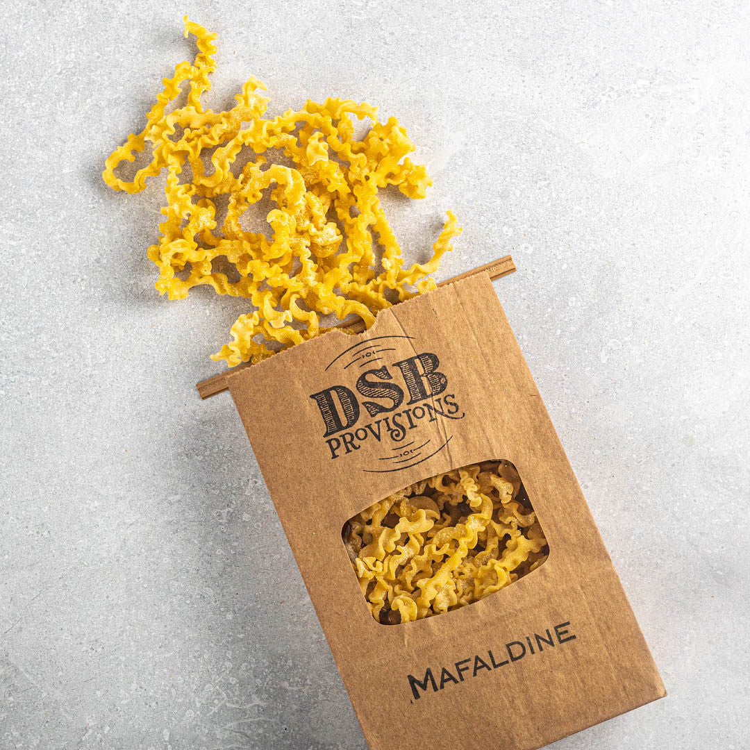 Our Whole Egg Mafaldine is made with eggs raised on pasture from our very own DSB Farms. Mafaldine, also called reginette,meaning little queens, is a favorite for the cooler weather!! Made with organic semolina. 1lb. Package serves 4-5